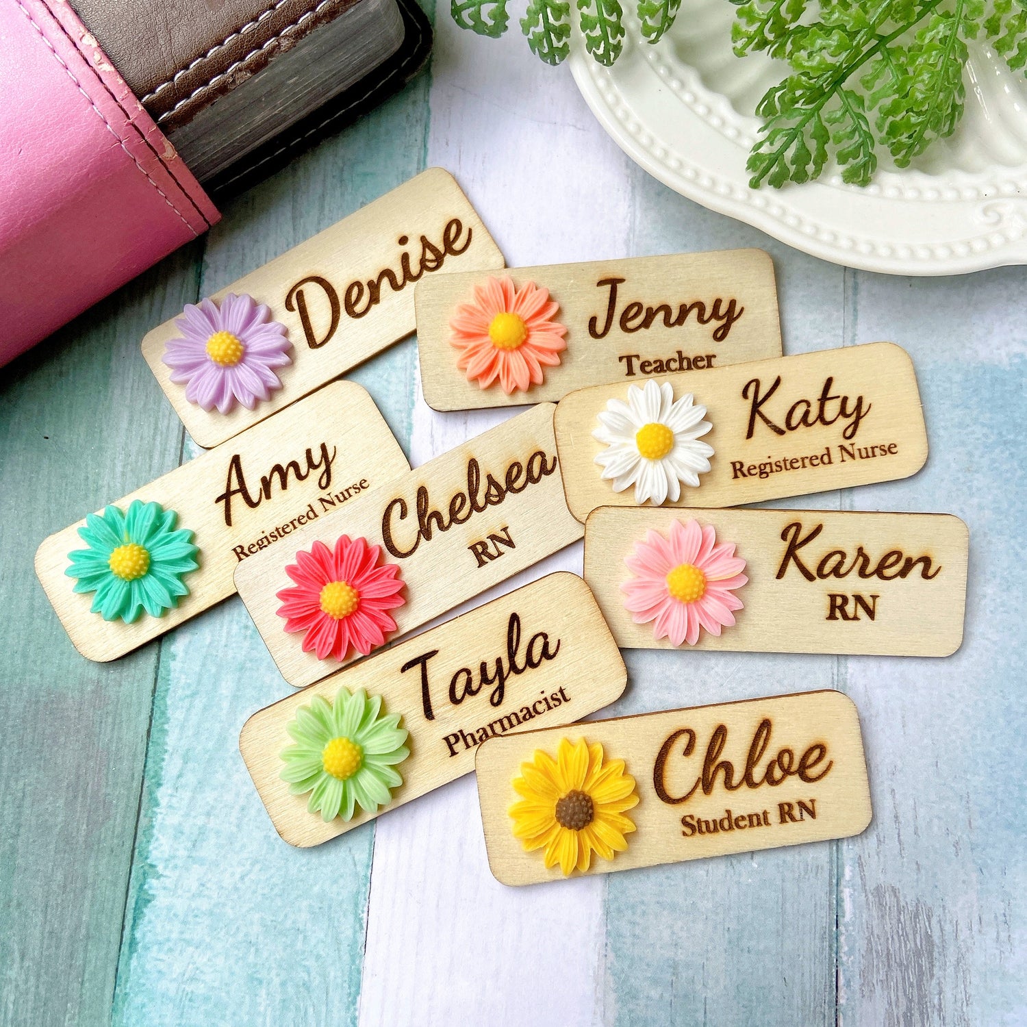 Personalised wooden name tags with unique 3D hand-painted designs. Perfect for teachers, professionals, and custom gifting.