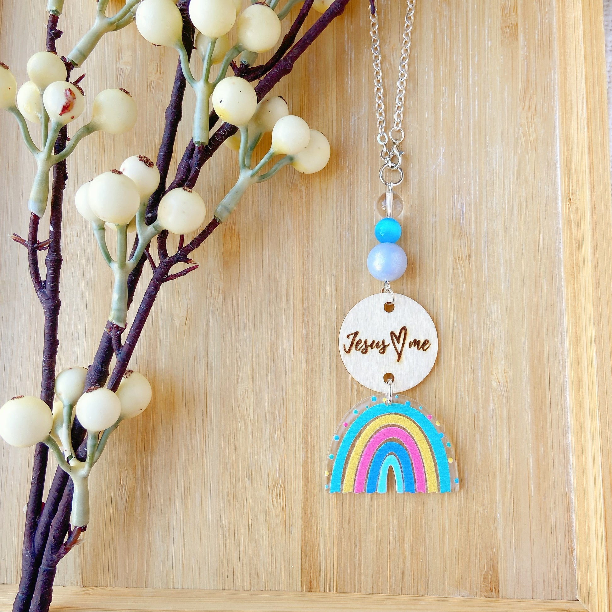 Bright Blue & Pink Boho Rainbow Bible Message Car Hanging Charm