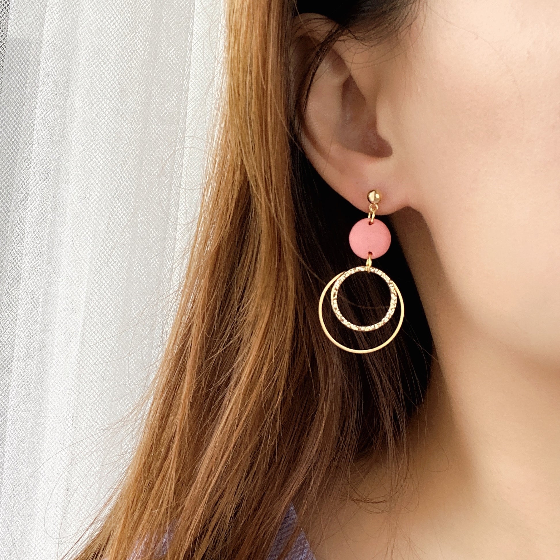 legant and effortlessly chic, these Dual Ring Dangle Earrings combine the warmth of gold with the softness of handcrafted polymer clay. Each pair features a round clay stud paired with interlocking metallic hoops — one sleek and one textured — creating a balanced and eye-catching geometric design.