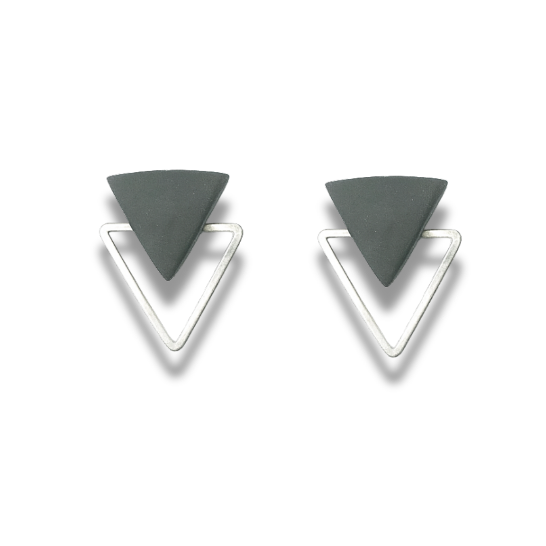 Dark Grey & Silver Triangle Dual-Layer Stud Earrings – Geometric Minimalist Collection