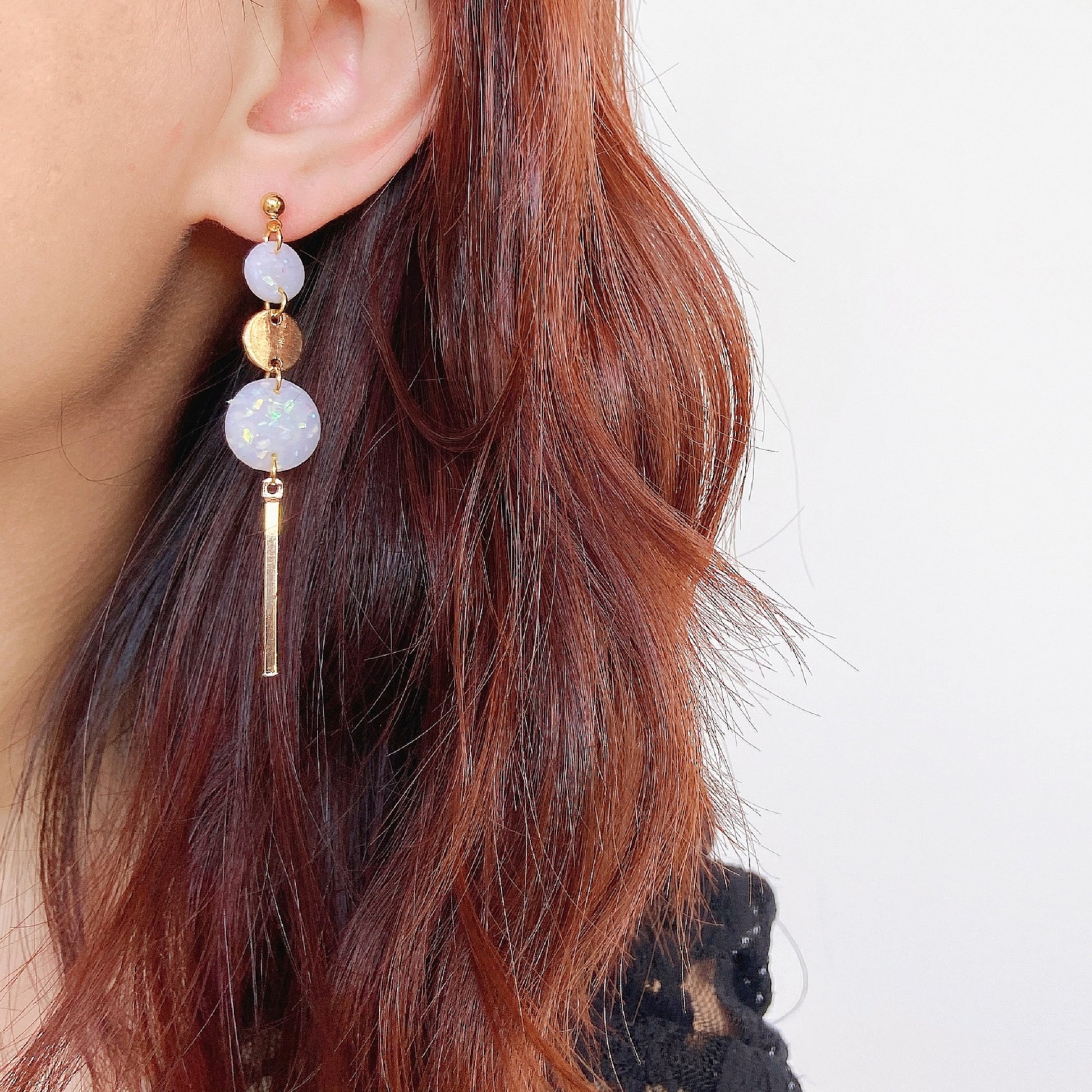 A chic and contemporary design that combines soft polymer clay textures with sleek metallic elements. These handmade earrings feature three cascading circles finished with a polished metal bar drop, creating a beautifully balanced silhouette that elongates the neck.
