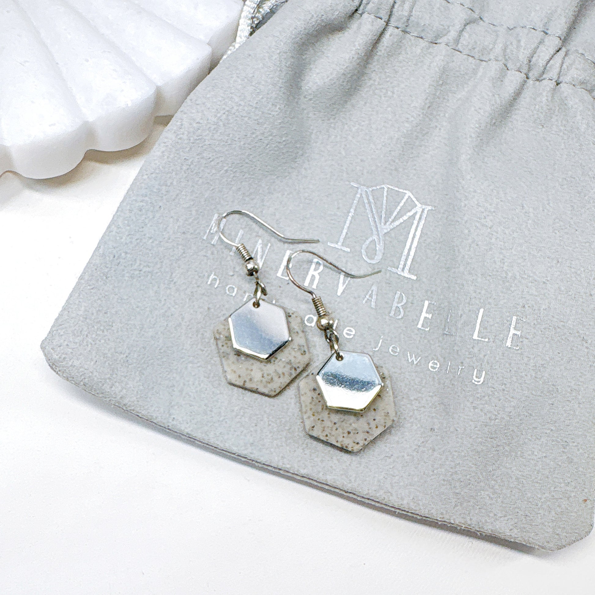 Elegant and minimal, these handmade polymer clay earrings feature a soft speckled stone texture paired with sleek metallic hexagon charms. Each piece is carefully hand-sculpted, sanded, and finished to create a modern yet organic look that pairs effortlessly with any outfit.