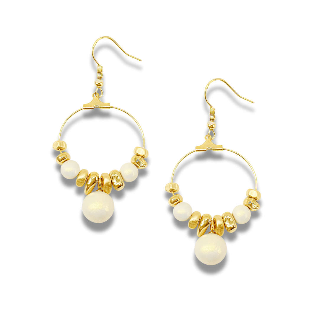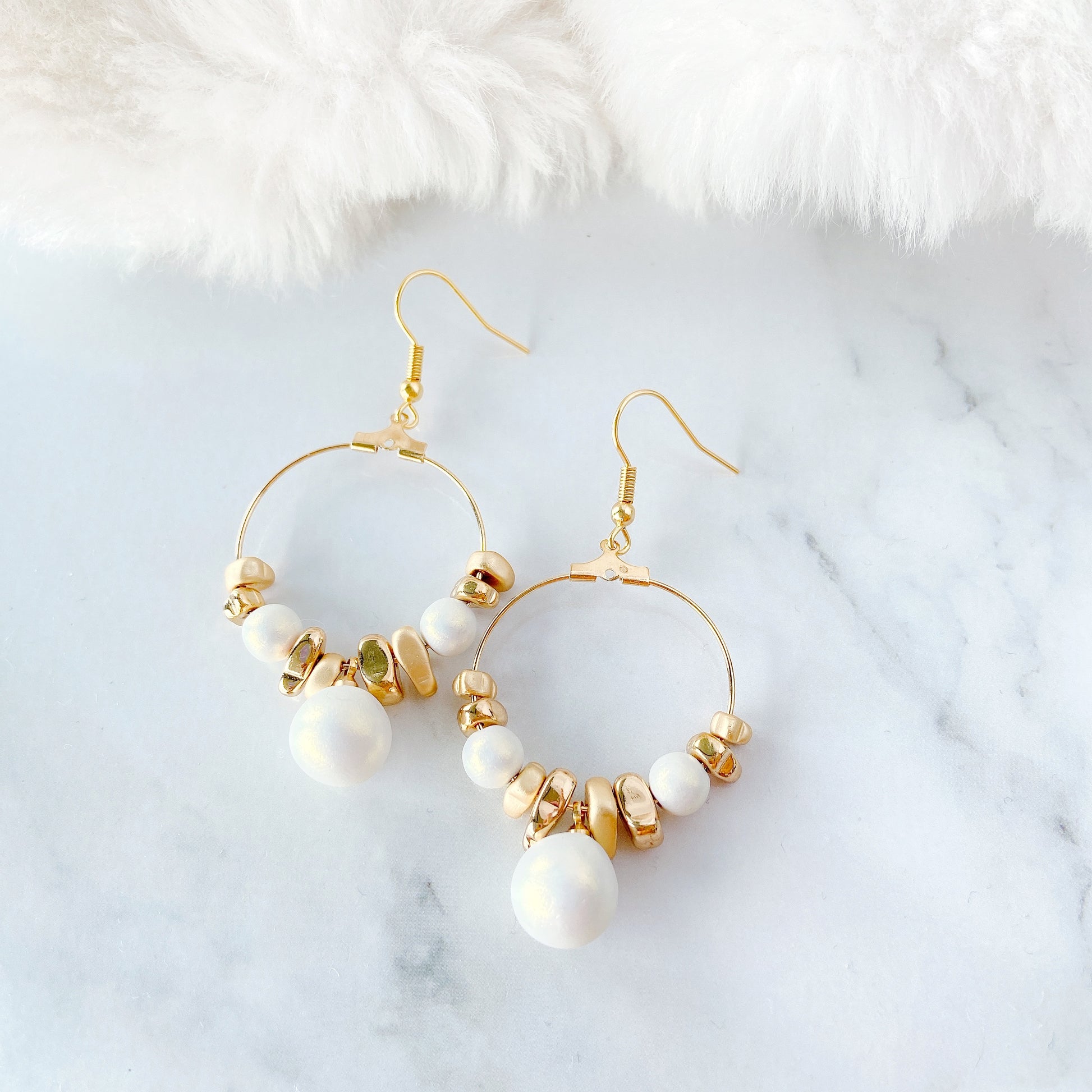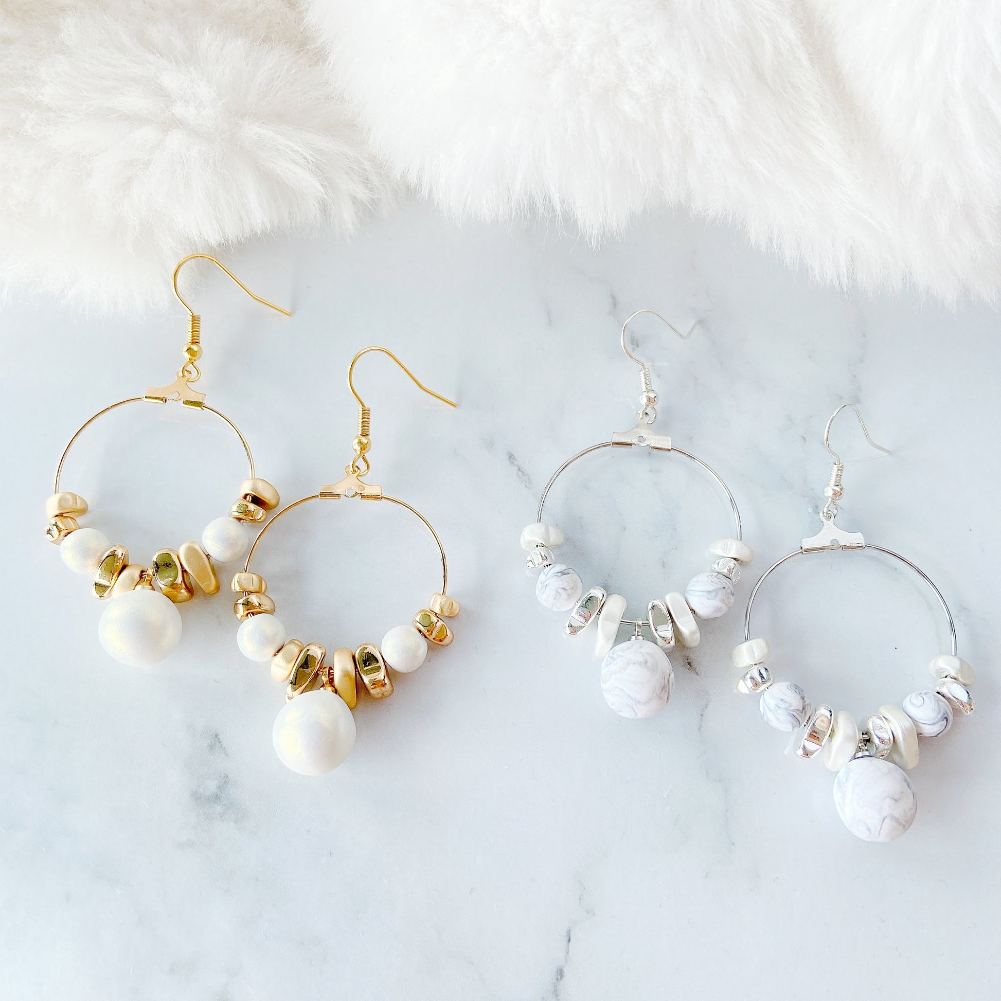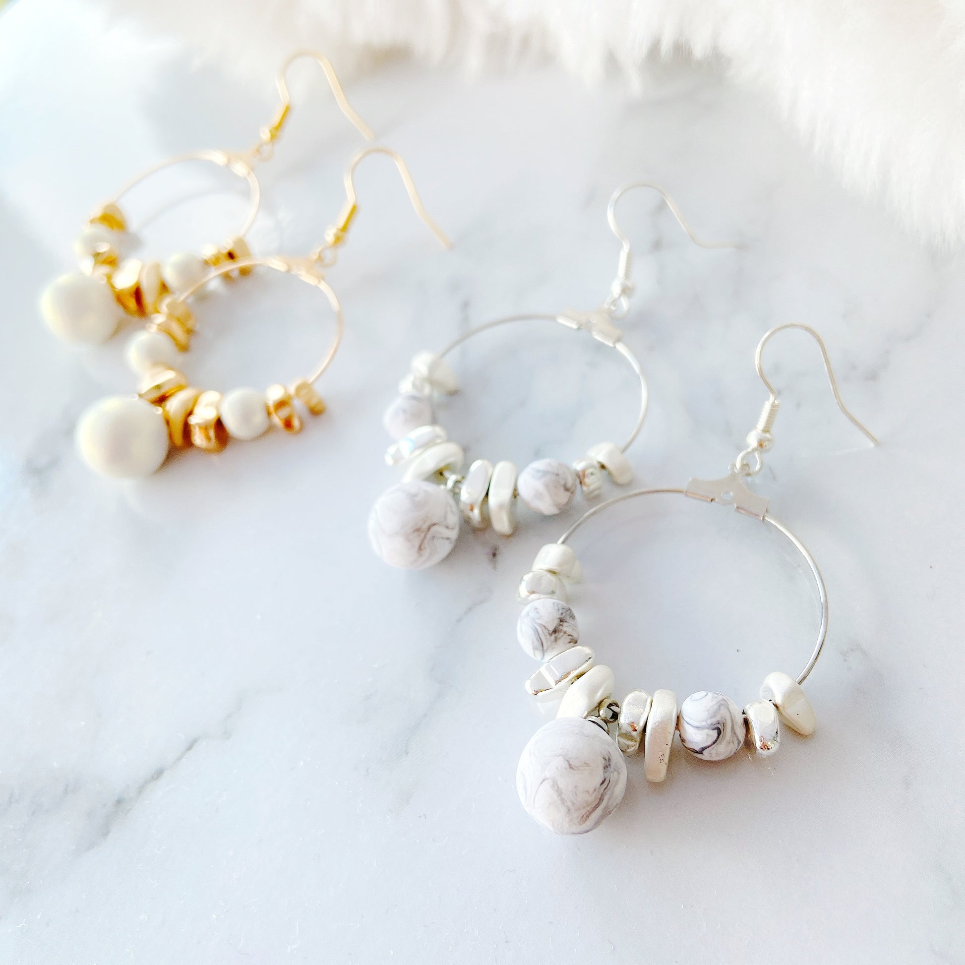 These handmade hoop earrings combine modern minimalism with soft, natural tones. Designed with a mix of smooth polymer clay beads, marble-style accents, and glossy metallic spacers, they bring a refined yet effortless charm to any outfit.