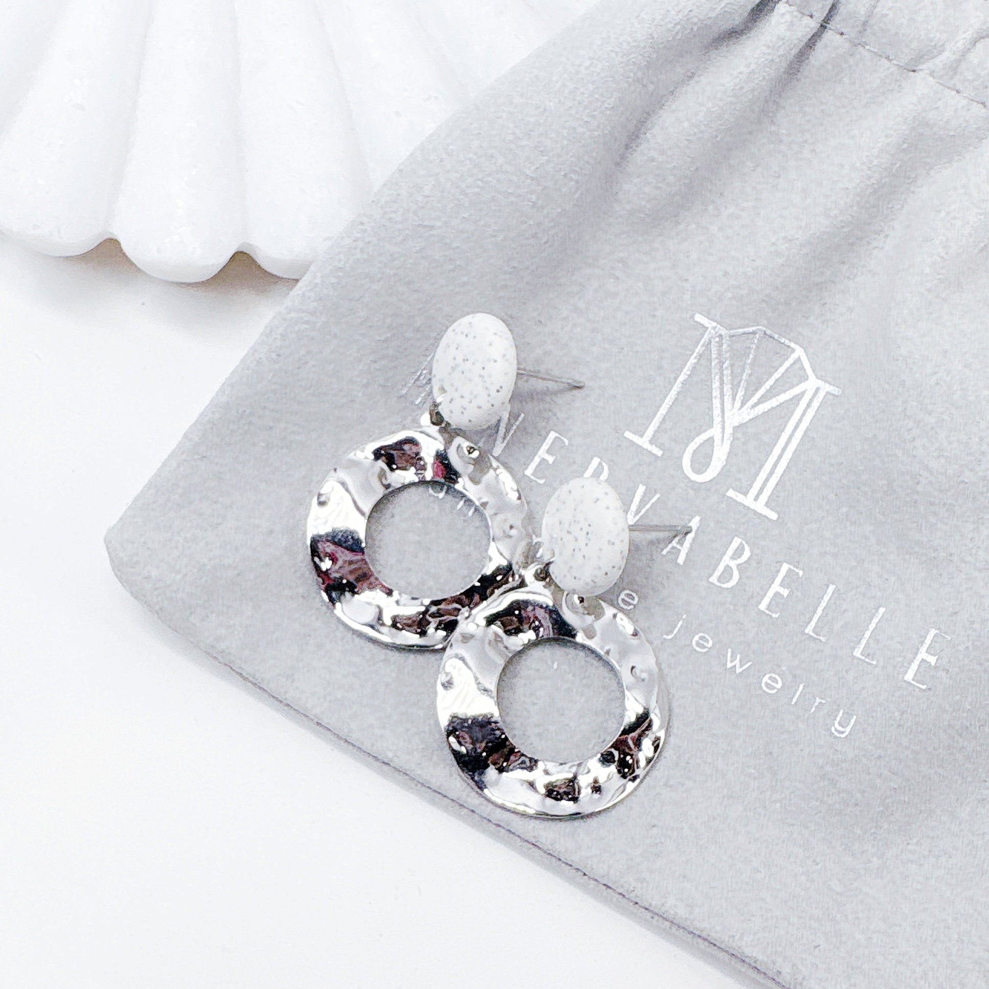 These stylish earrings blend organic texture with modern charm. Featuring handcrafted polymer clay studs with a soft speckled finish, paired with hammered metal open-circle drops in gold or silver, they bring effortless sophistication to your everyday look.
