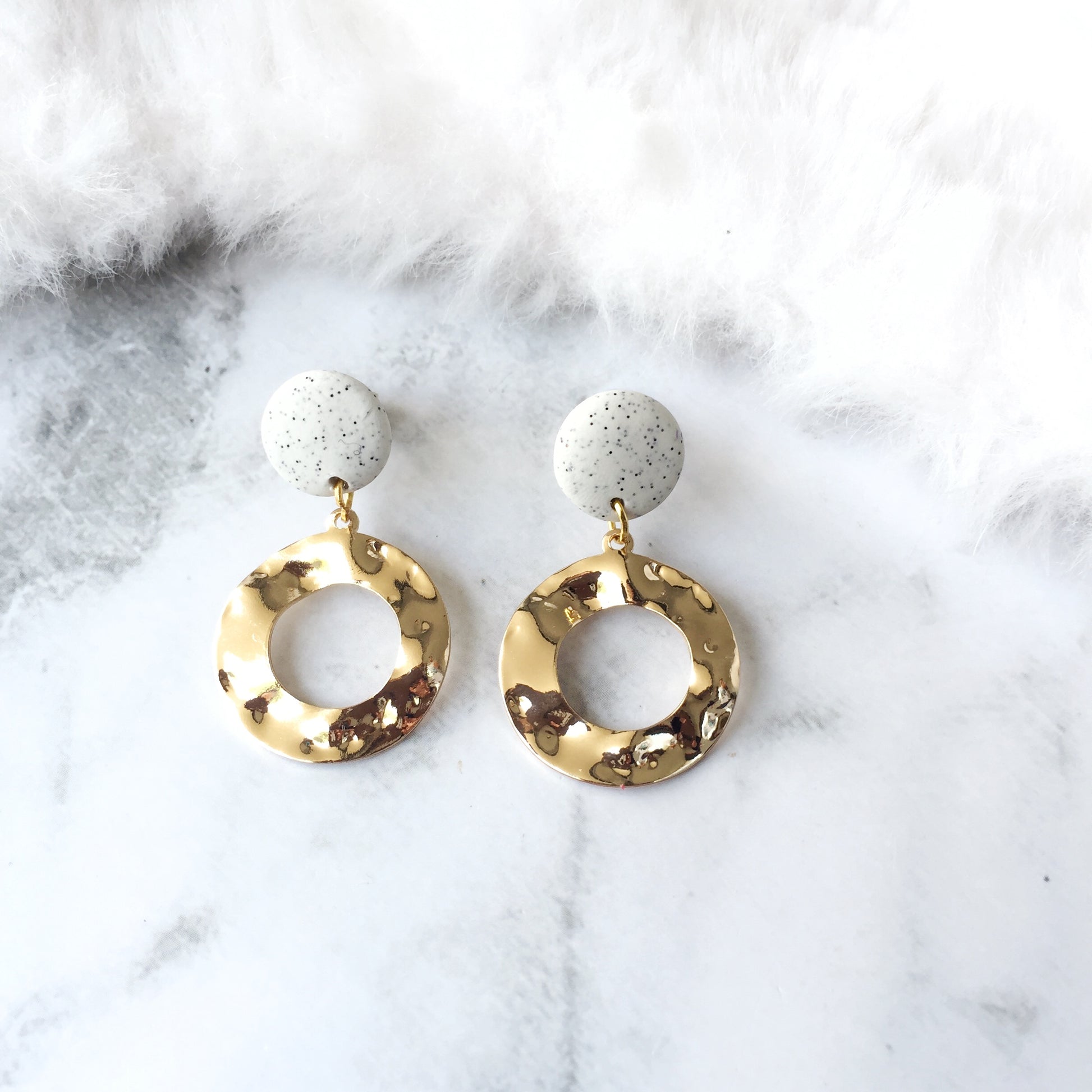 Golden Textured Metal Circle Earrings with Speckled Clay Earrings
