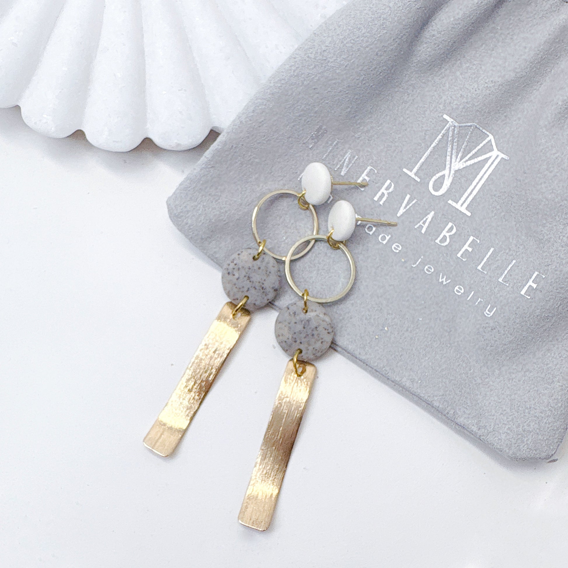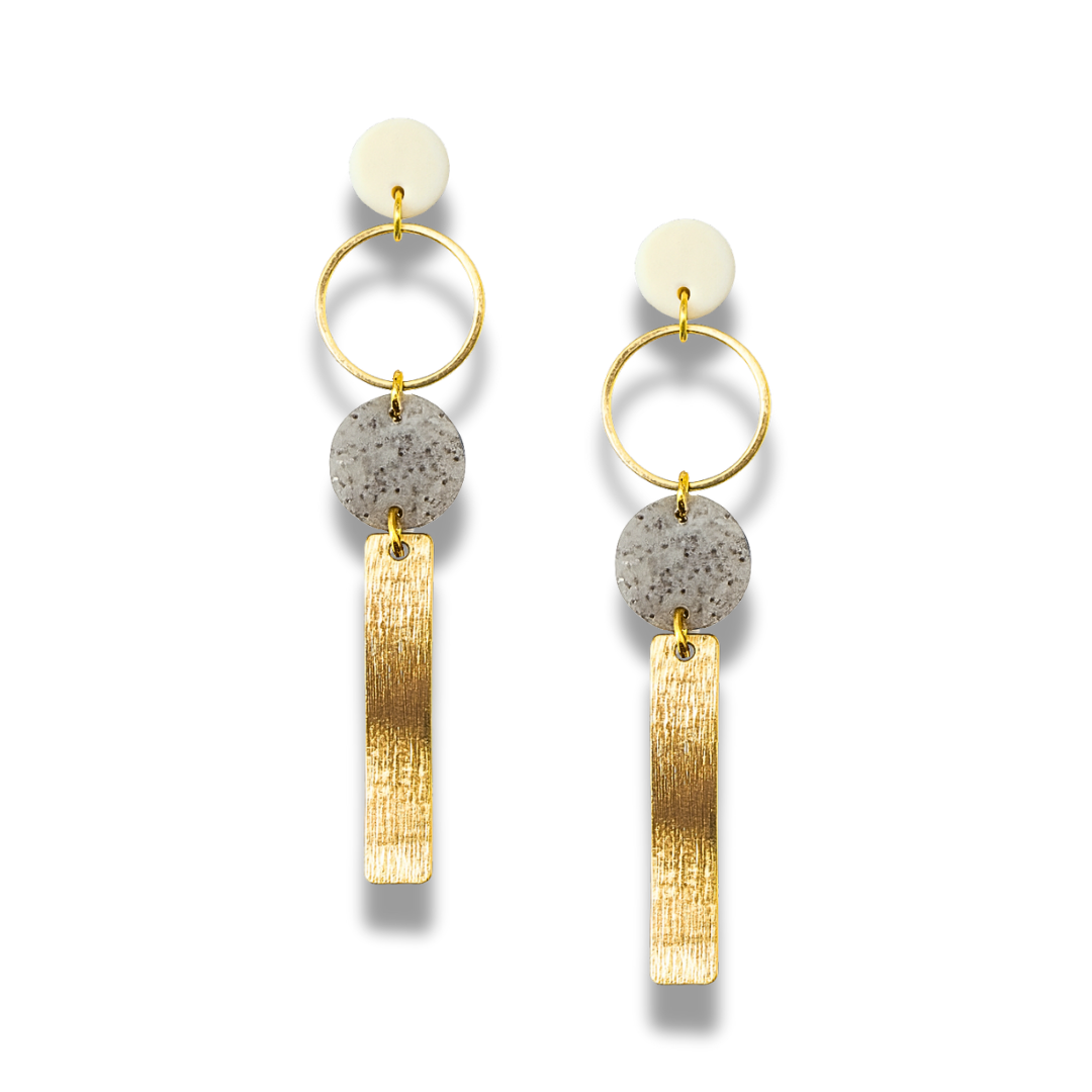 These modern dangle earrings feature a chic mix of textures and finishes – with two handmade polymer clay discs at the center of the design. Each clay piece is carefully crafted by hand, making every pair unique.