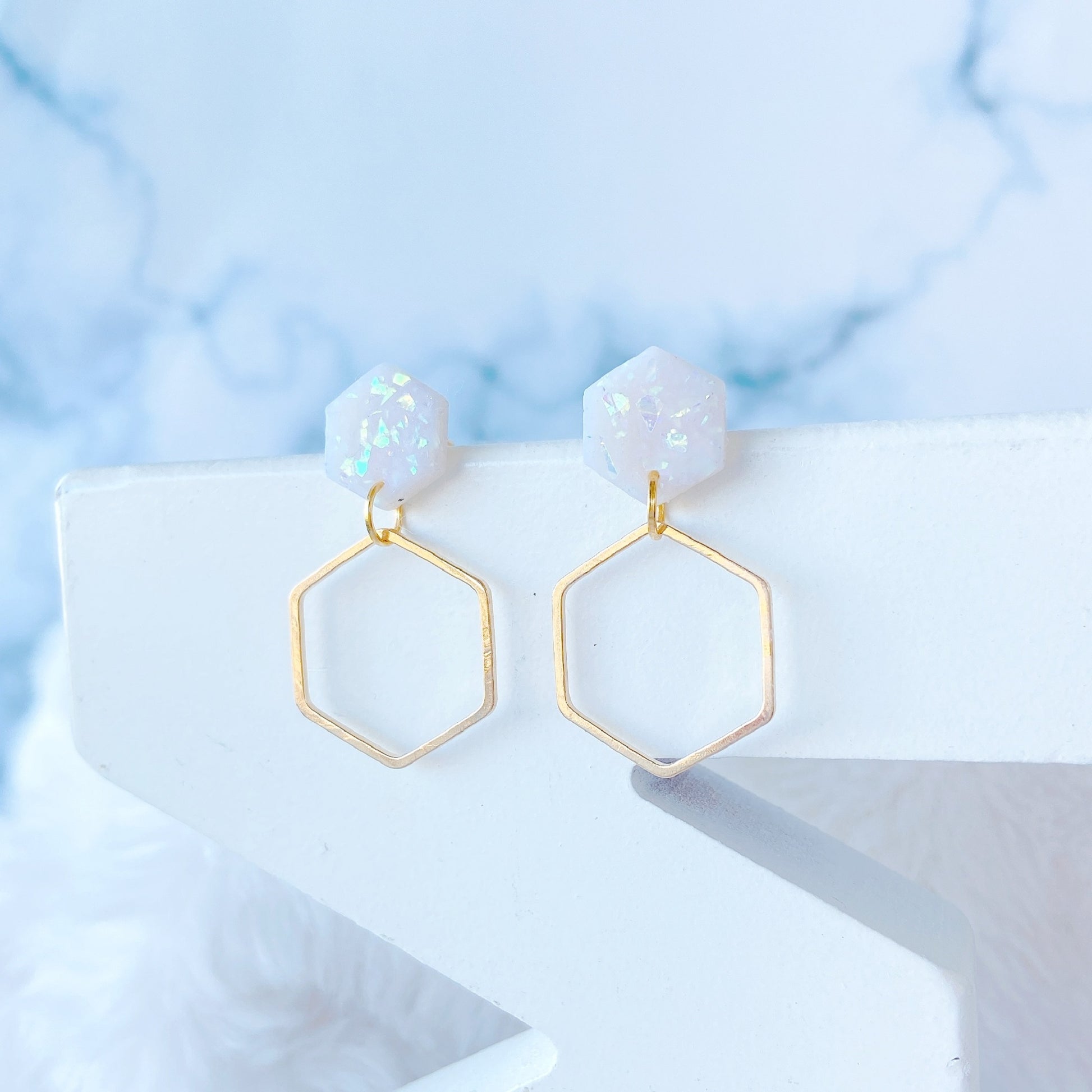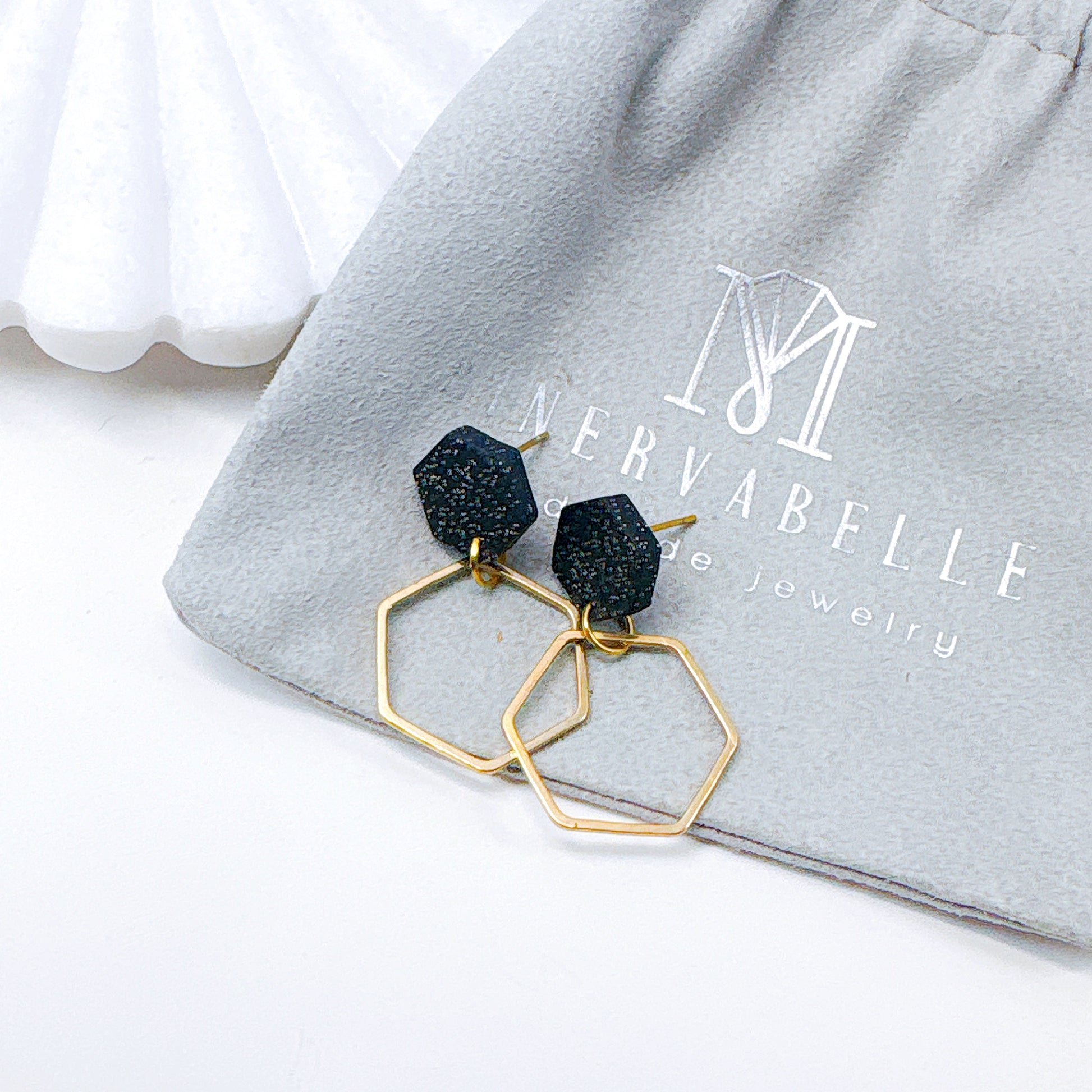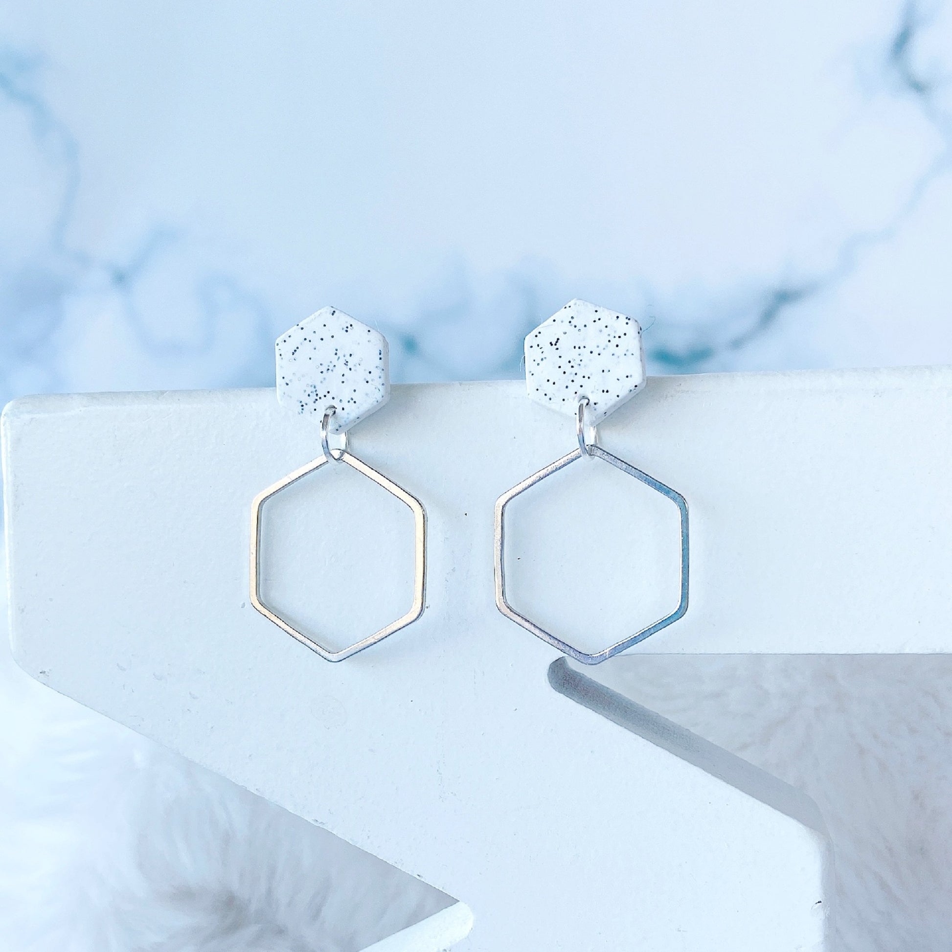 Elegant and modern, these handmade earrings feature a unique double hexagon design — pairing polymer clay with sleek metallic frames for a balanced geometric aesthetic. Each pair combines minimalist lines with delicate textures and finishes, making them perfect for everyday sophistication.