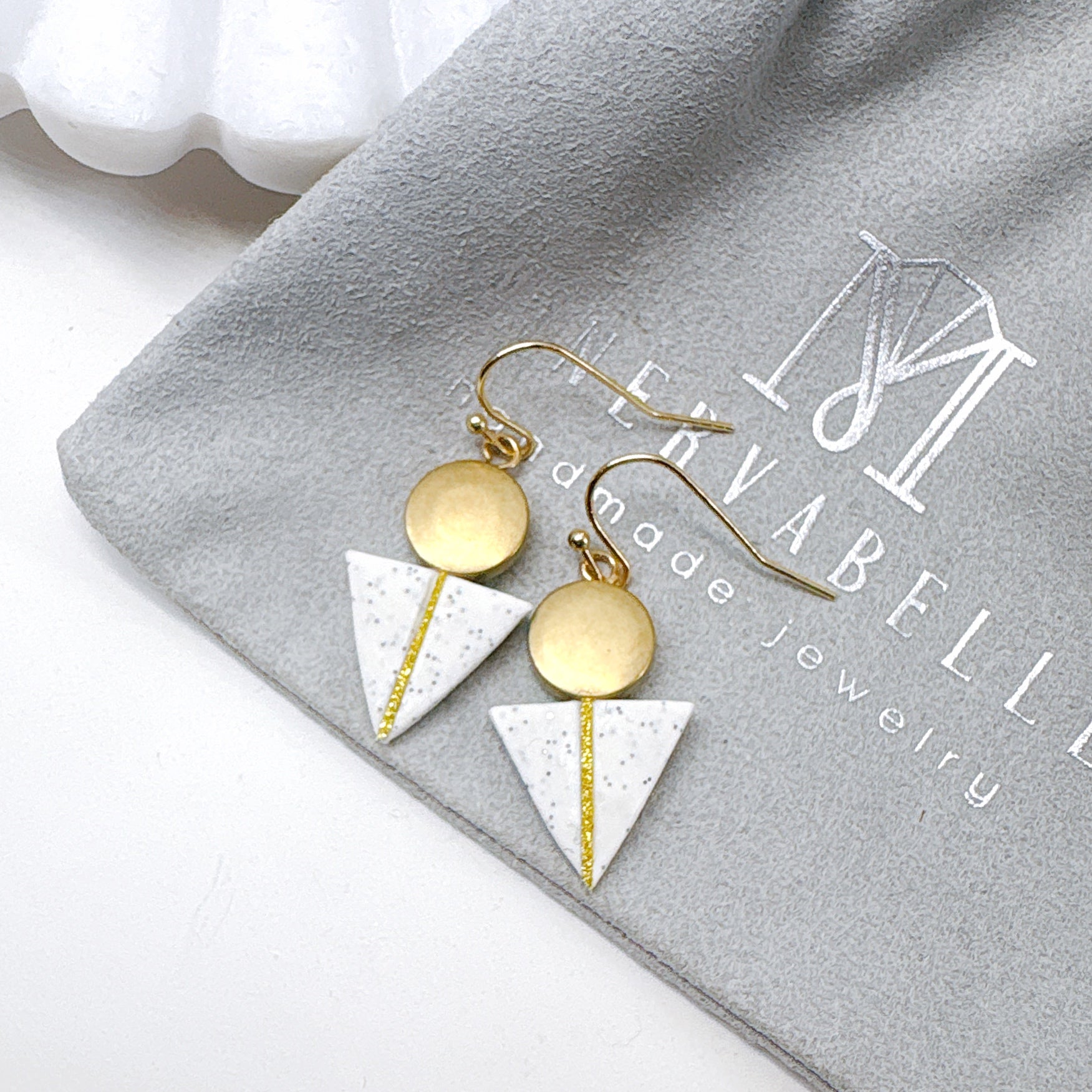 Sleek and contemporary, these Triangle Geo Earrings blend minimalist geometry with a touch of glam. Each pair features a bold triangular polymer clay piece accented with a fine metallic gold line, paired with a brushed brass circle for a balanced and elegant silhouette.