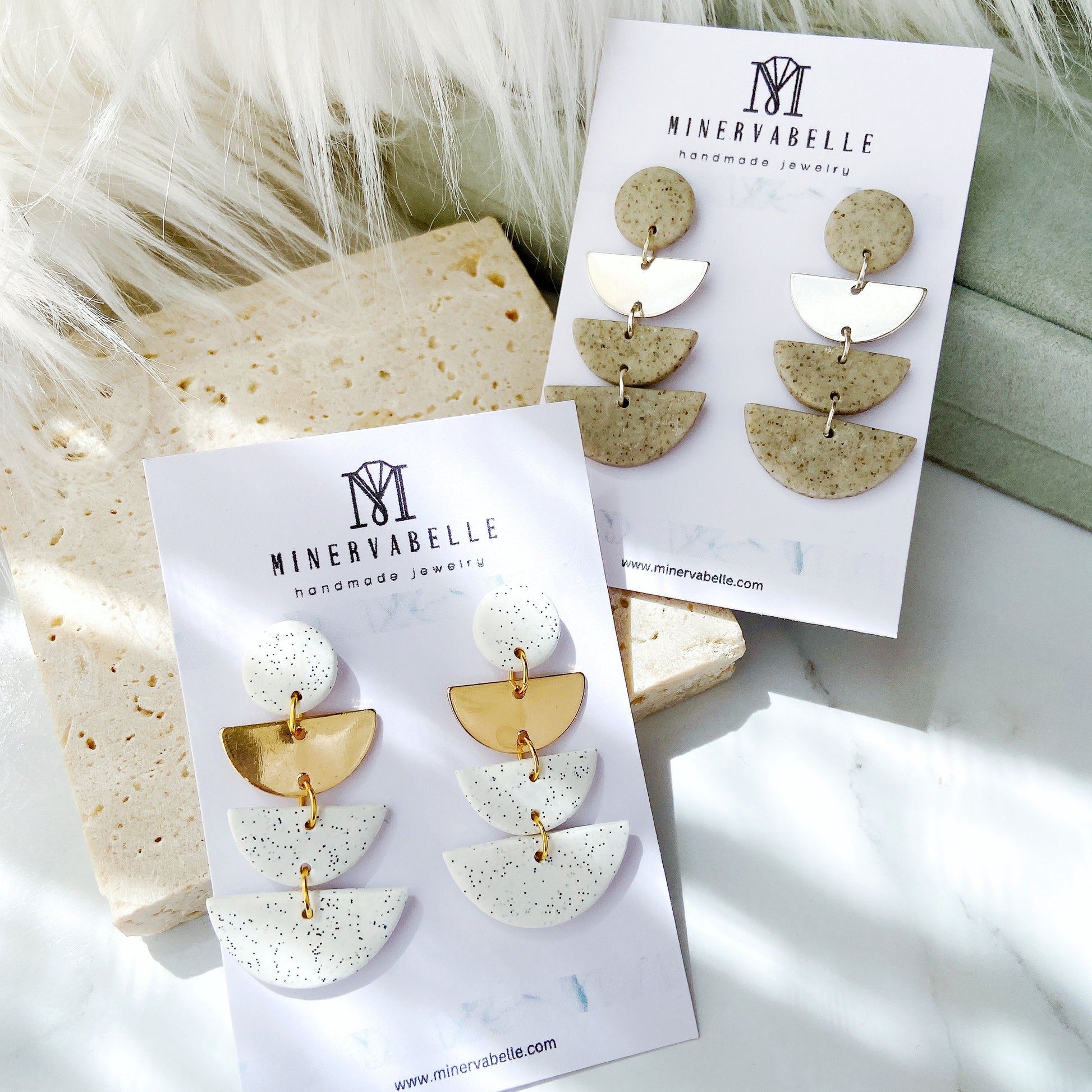 These Triple Arc Layered Earrings combine modern geometric design with soft, neutral tones for a balanced, elegant statement look. Handcrafted from high-quality polymer clay, each earring features three stacked semi-circle and round shapes accented with metallic gold or silver finishes.