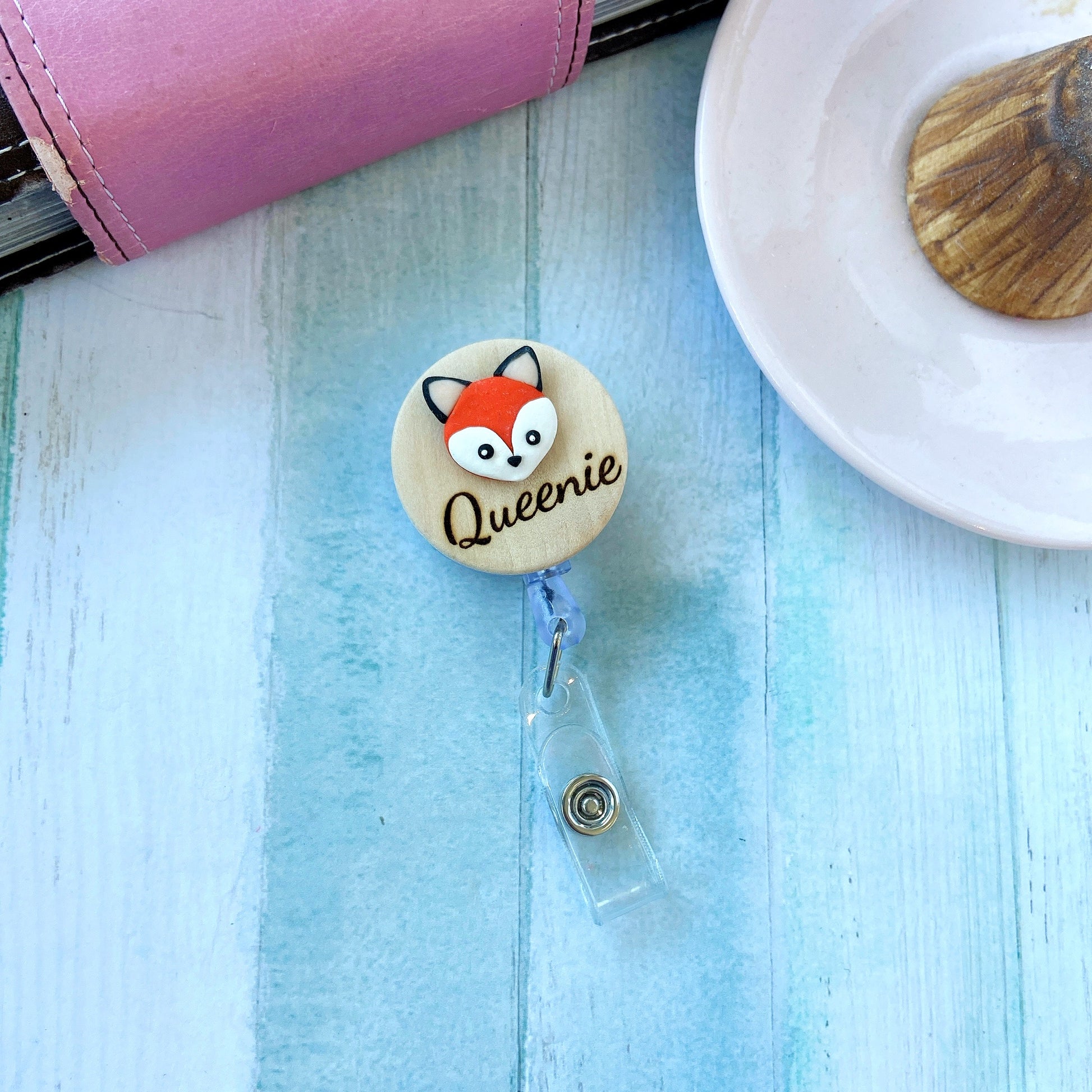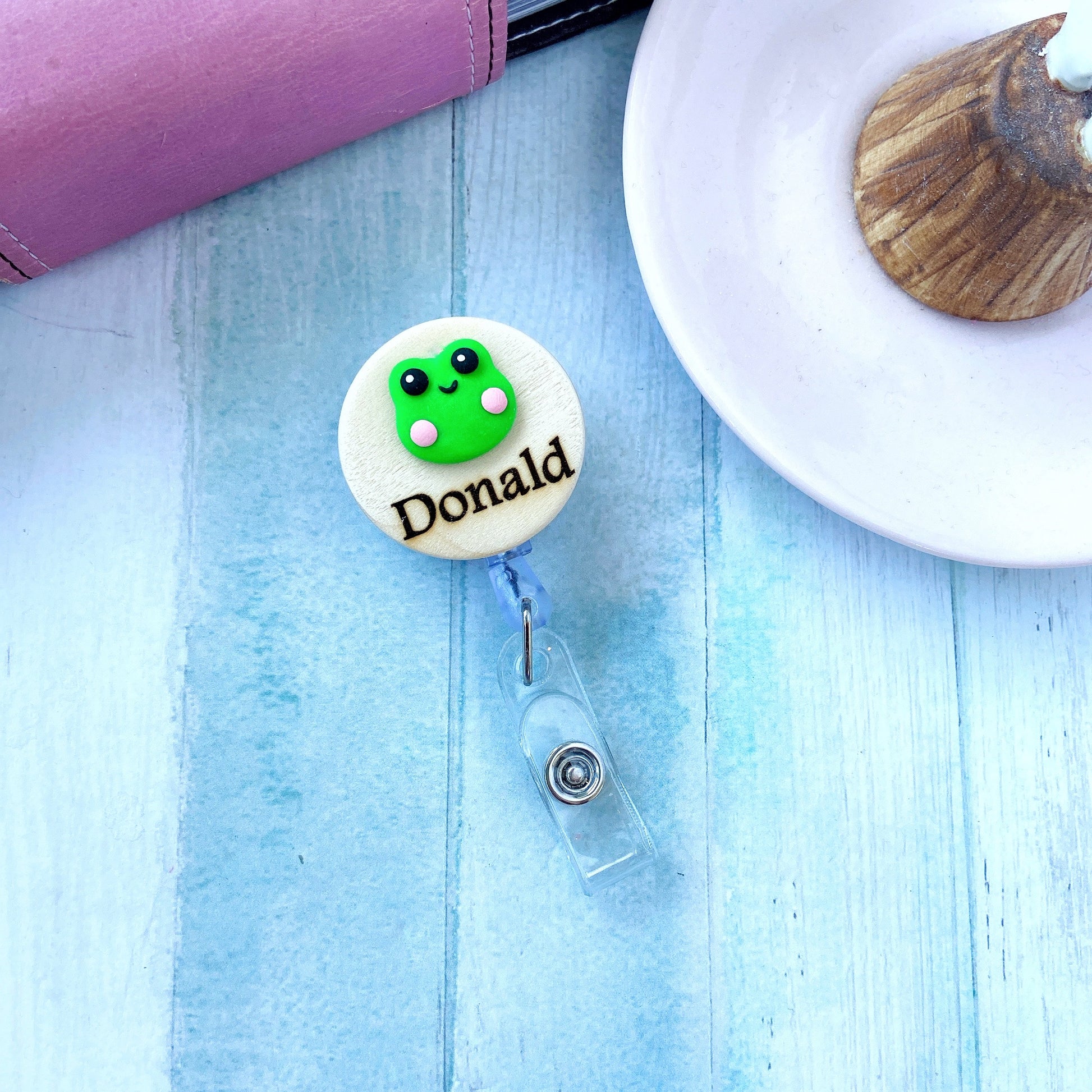 Add a touch of fun and personality to your workday with this handcrafted wooden badge reel! Featuring a round wood base and a 3D handmade clay charm on top, this ID holder is custom engraved with your name – making it both practical and uniquely yours.