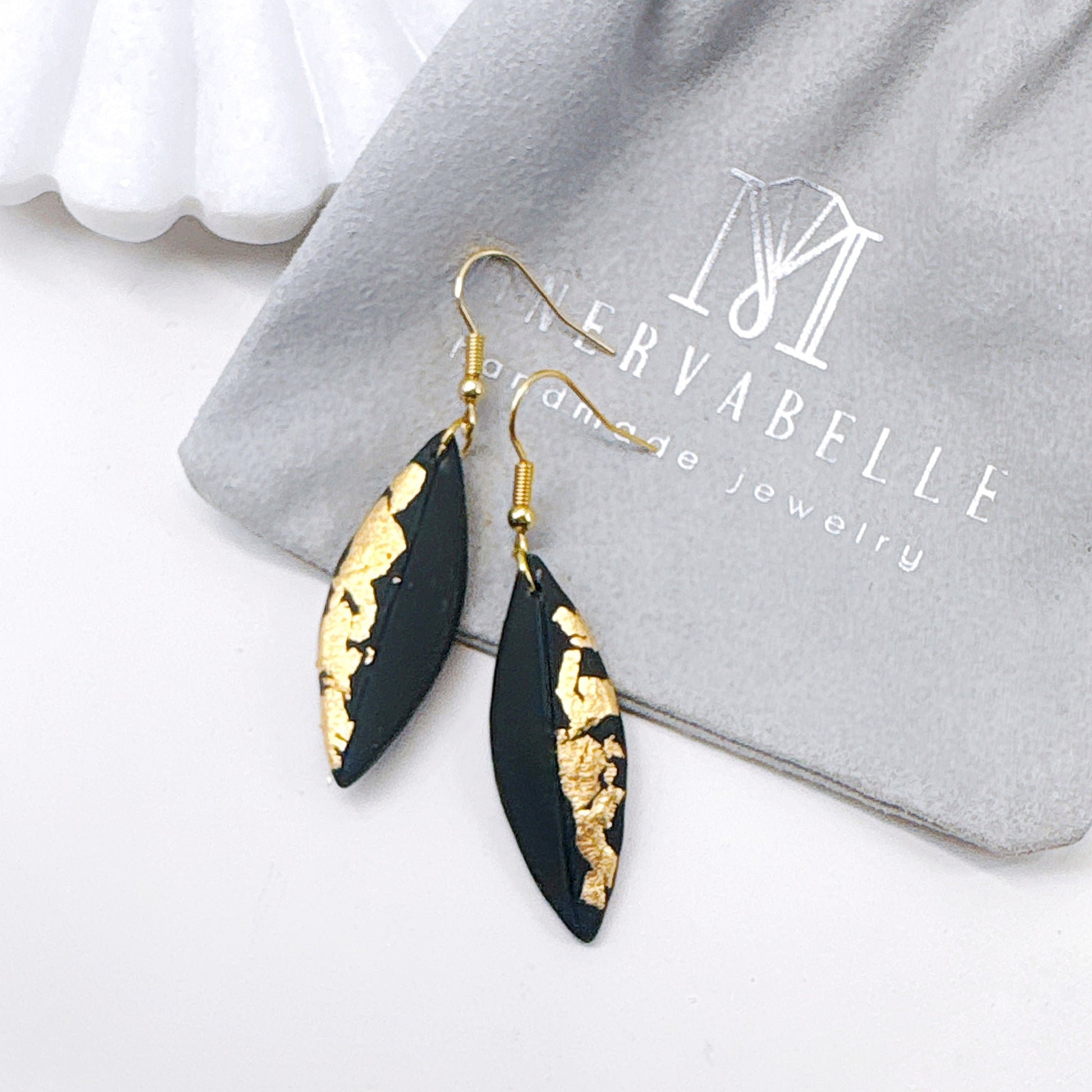 Handmade Black and Gold Leaf Earrings – Polymer Clay Marquise Dangle Earrings