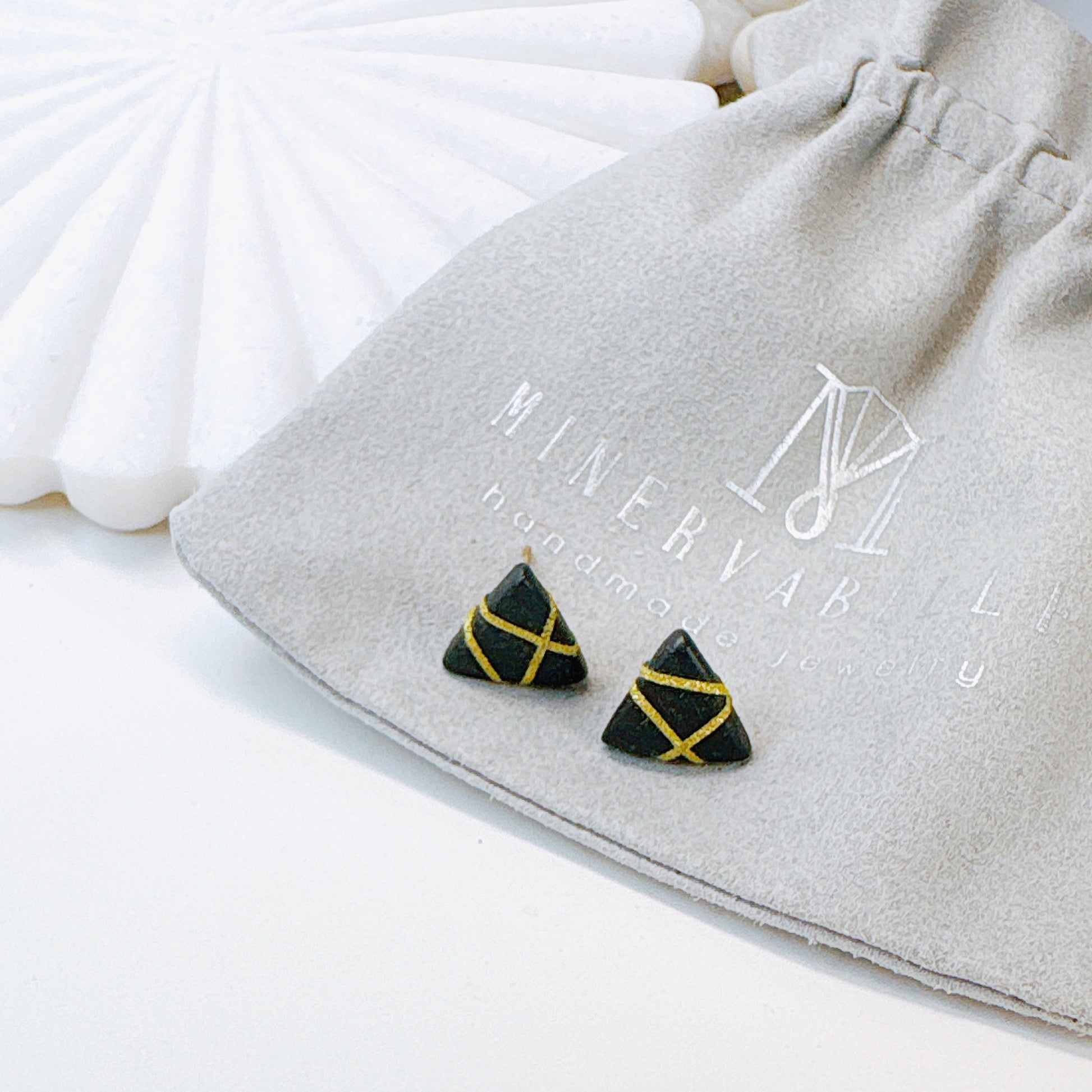 Black Polymer Clay Triangle Stud Earrings with Gold Glitter Line Design