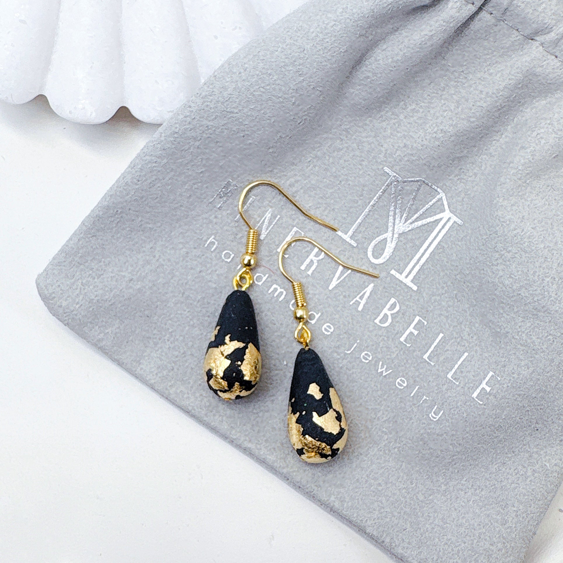Handmade Black Gold Leaf Polymer Clay Teardrop Dangle Earrings