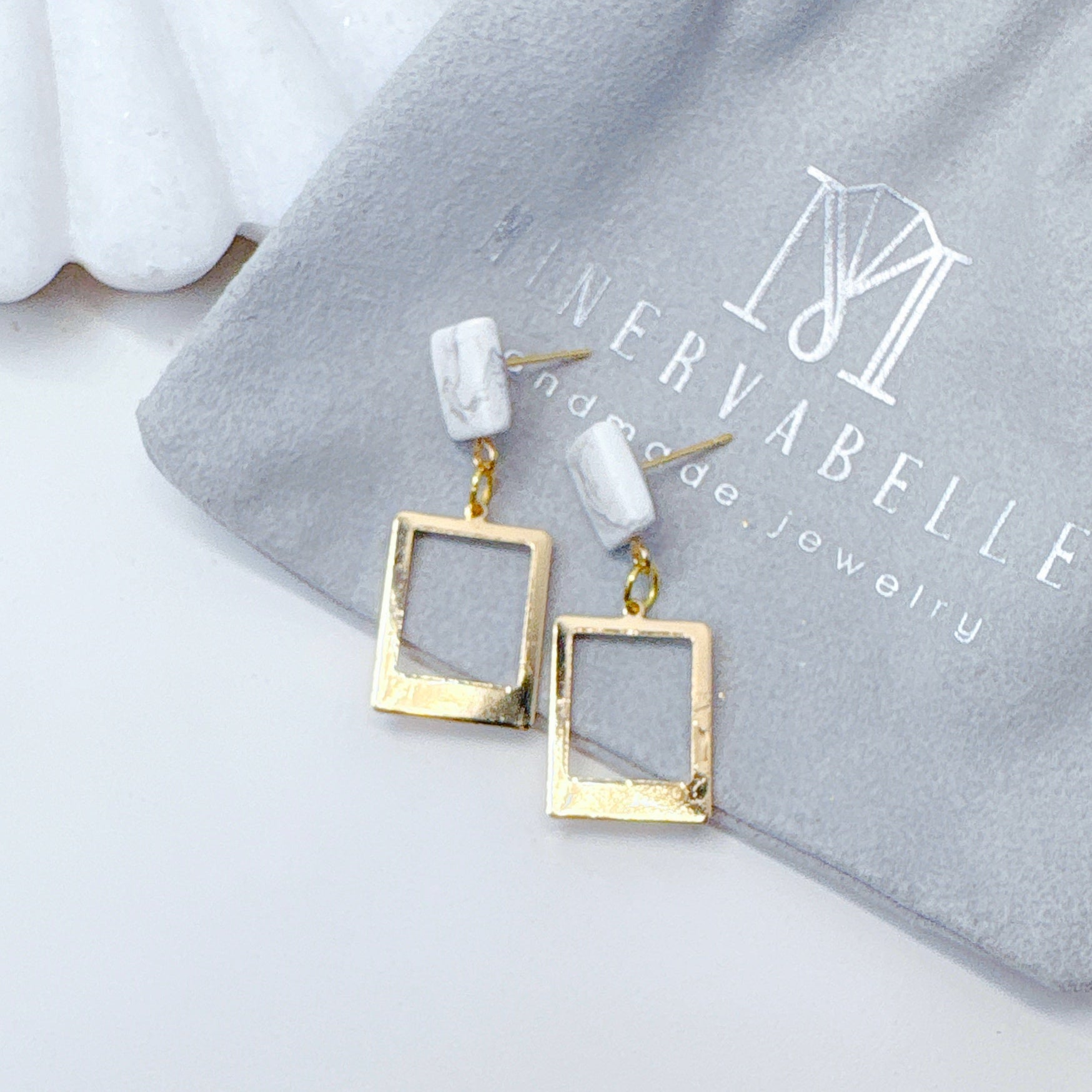 A sleek and modern pair of earrings featuring handmade white marble-effect polymer clay studs paired with polished gold rectangular frames. The contrast between the natural marbling texture and the smooth metallic shine creates a refined and timeless aesthetic, perfect for both everyday wear and elegant occasions.