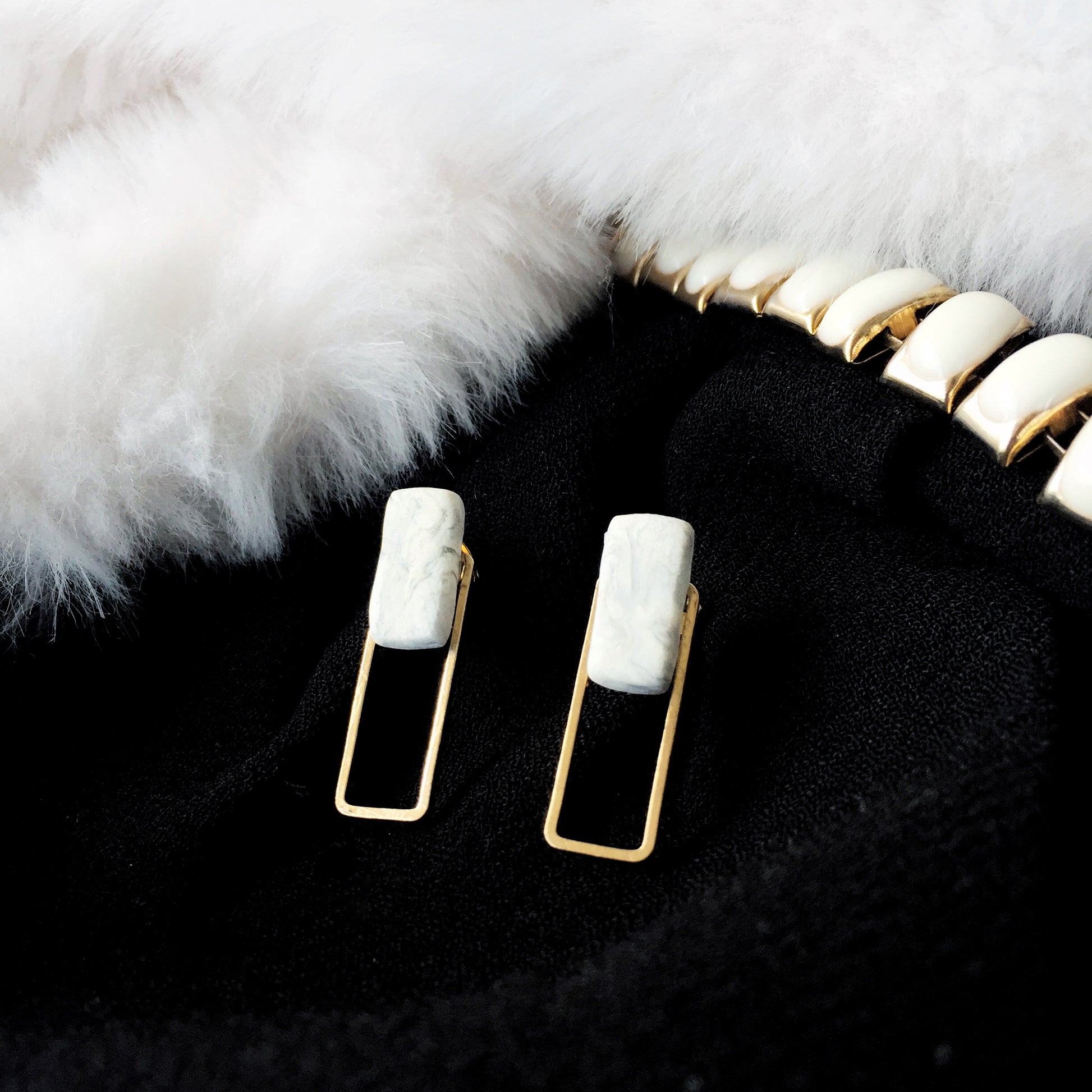 Elegant and modern, these handcrafted polymer clay stud earrings feature a smooth marble texture paired with a sleek rectangular metal frame that sits flush against the clay base — creating a clean, structured look. The minimalist design offers a perfect balance of texture and shine, ideal for both everyday wear and special occasions.