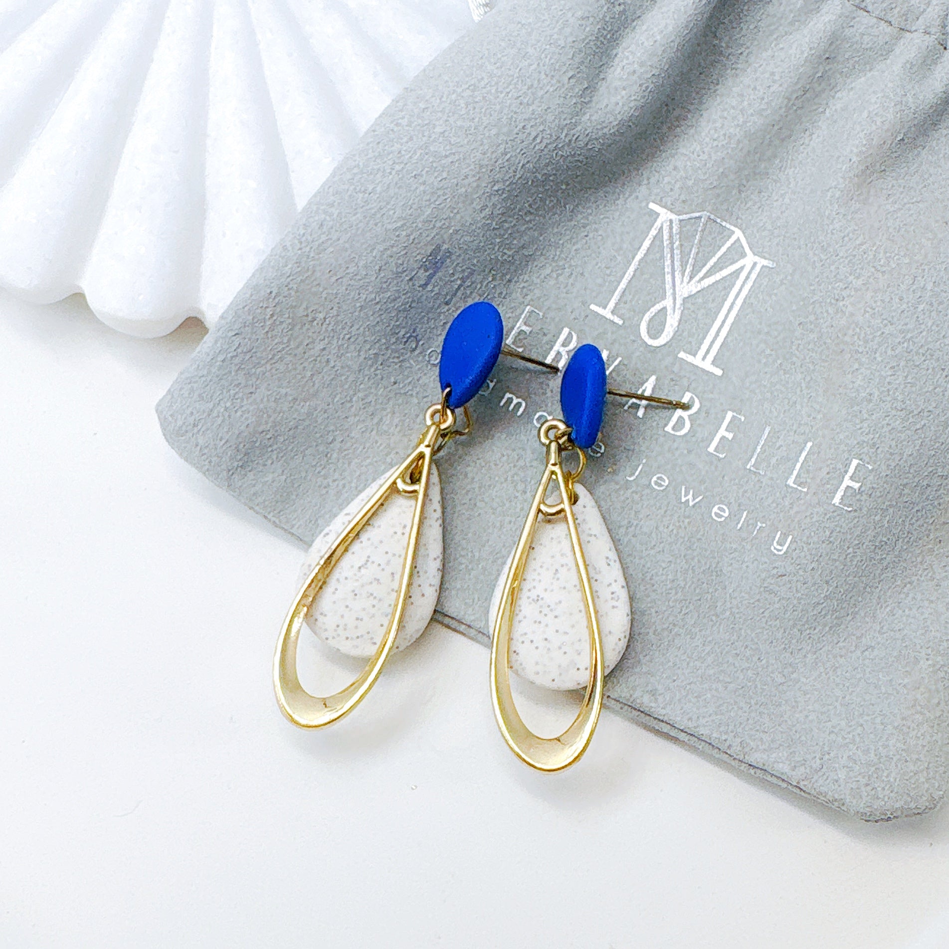Elegant and modern, these handcrafted earrings combine soft matte polymer clay with sleek metallic teardrop frames.