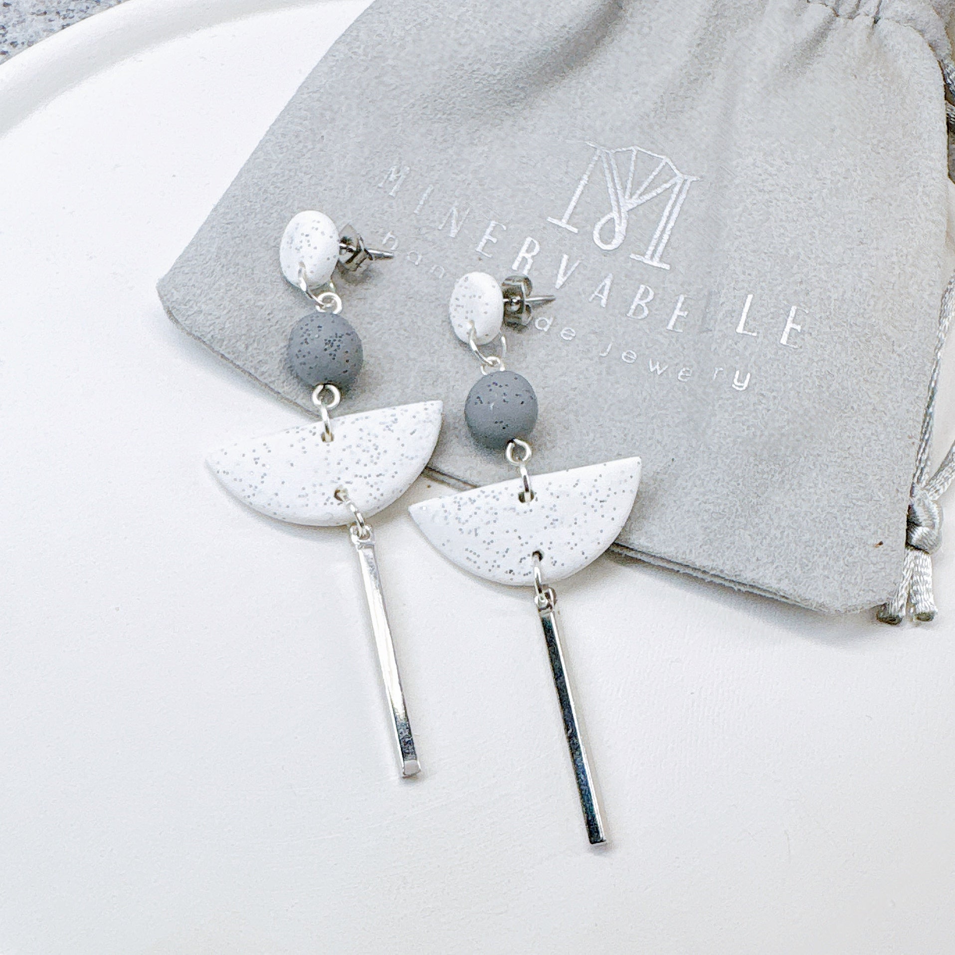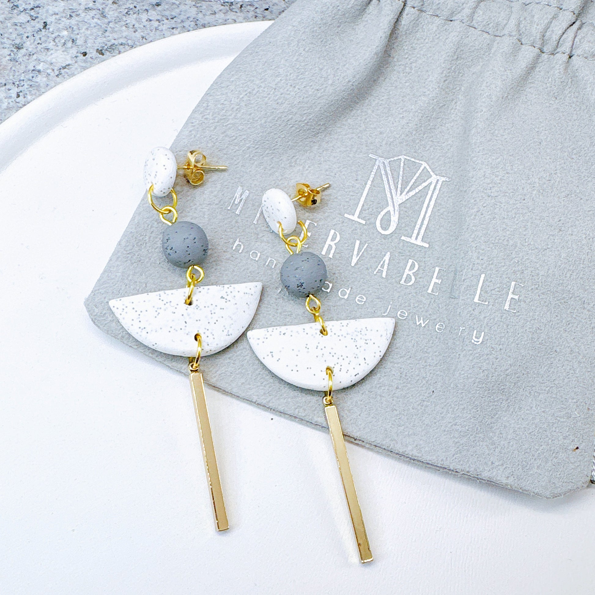 Modern and stylish, these handmade semicircle dangle earrings are crafted from polymer clay and paired with sleek golden metal sticks. Finished with hypoallergenic surgical steel posts, they bring a unique geometric touch to any outfit.
