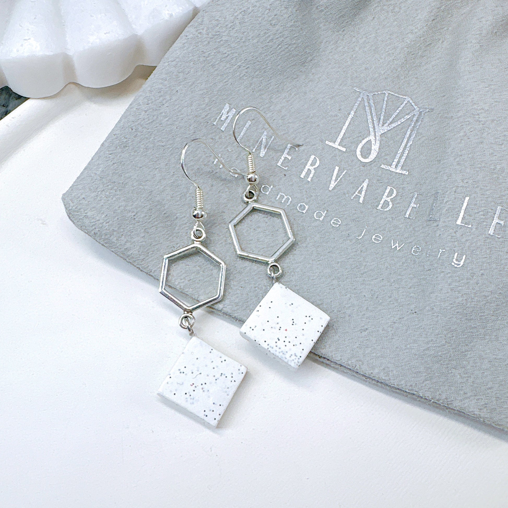 These handmade hexagon dangle earrings are sculpted from polymer clay and finished with hypoallergenic surgical steel ear wires. A modern yet elegant style that suits both everyday wear and special occasions.