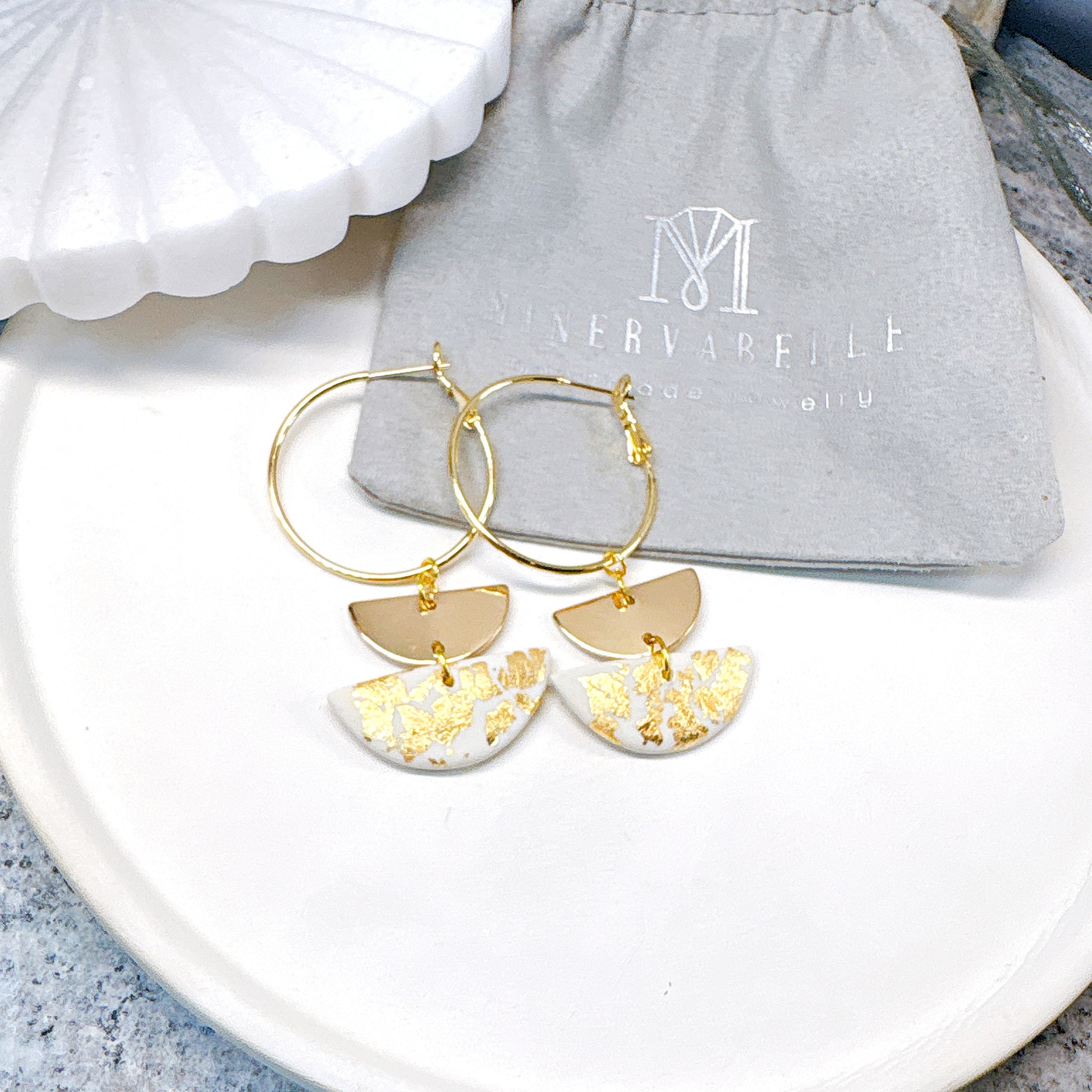 Handcrafted to capture timeless elegance, these earrings feature a delicate balance of modern geometry and natural shimmer. Each piece showcases hand-applied gold leaf over smooth polymer clay, suspended gracefully from sleek golden hoops. The soft marbled base and organic gold patterns reflect light beautifully, adding effortless sophistication to any outfit.