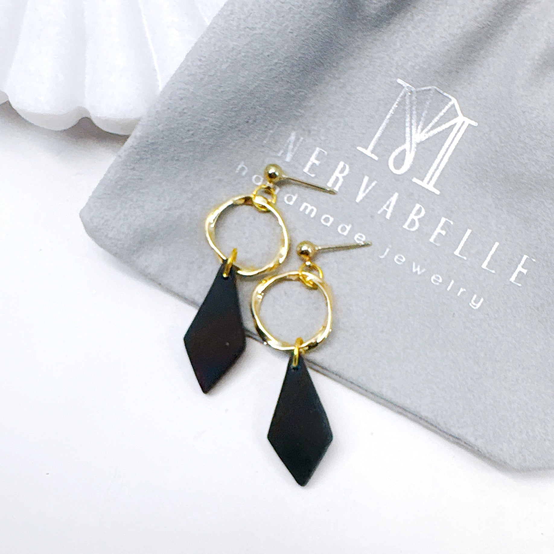 Paired with a hammered gold ring, the diamond-shaped drops come in a selection of neutral and earthy tones — black, ivory, white stone, terracotta, and dusty blue — making them perfect for both everyday wear and stylish occasions.
