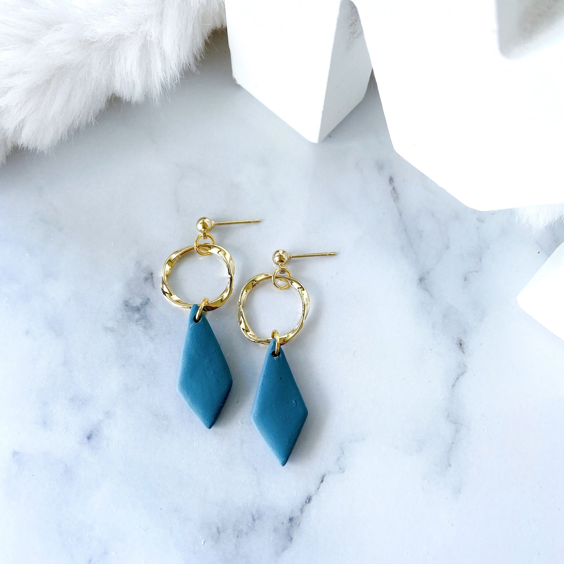 These Diamond Drop Earrings feature clean geometric lines and a minimalist gold hoop for a chic, contemporary look. Each pair is handcrafted from high-quality polymer clay, giving a smooth matte finish that balances bold shape with understated elegance.