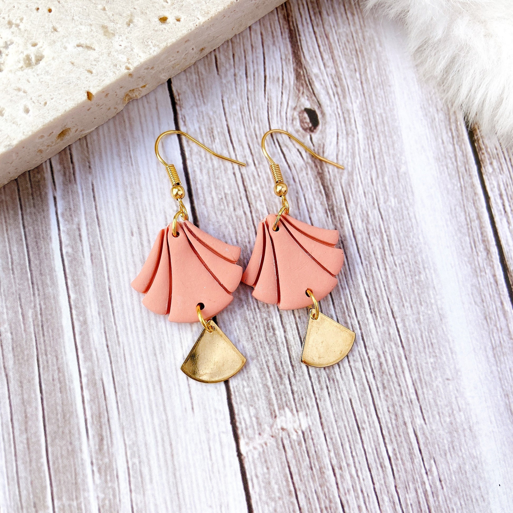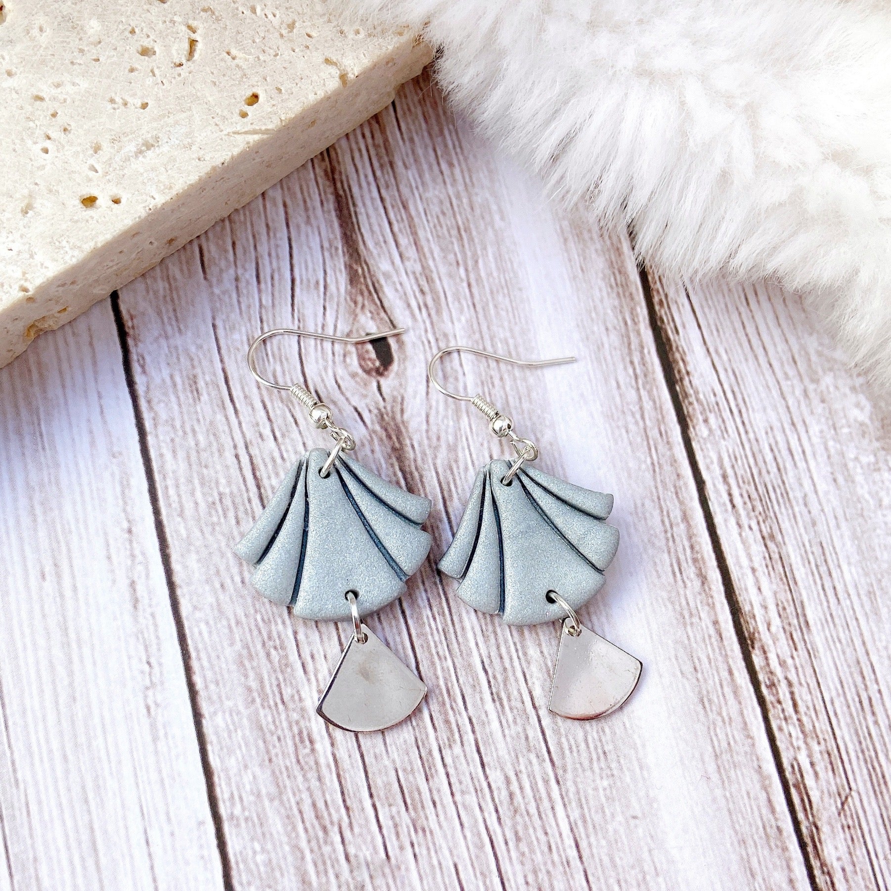 Each piece is made from polymer clay, sculpted into soft folds resembling a delicate fan, and finished with a polished metal charm that sways gracefully with every movement.