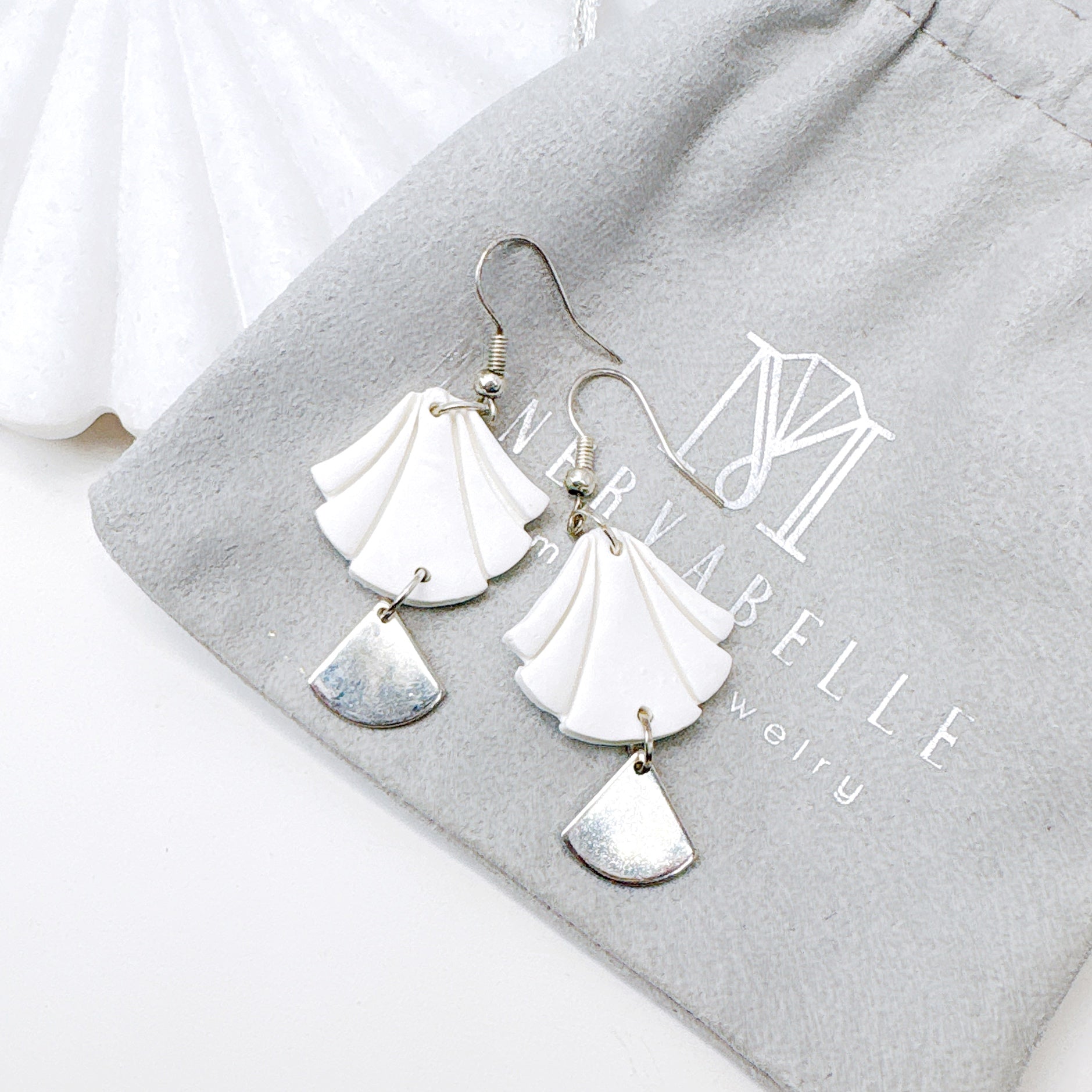 White Handmade Polymer Clay Fan Earrings with Polished Silver Metal Accent