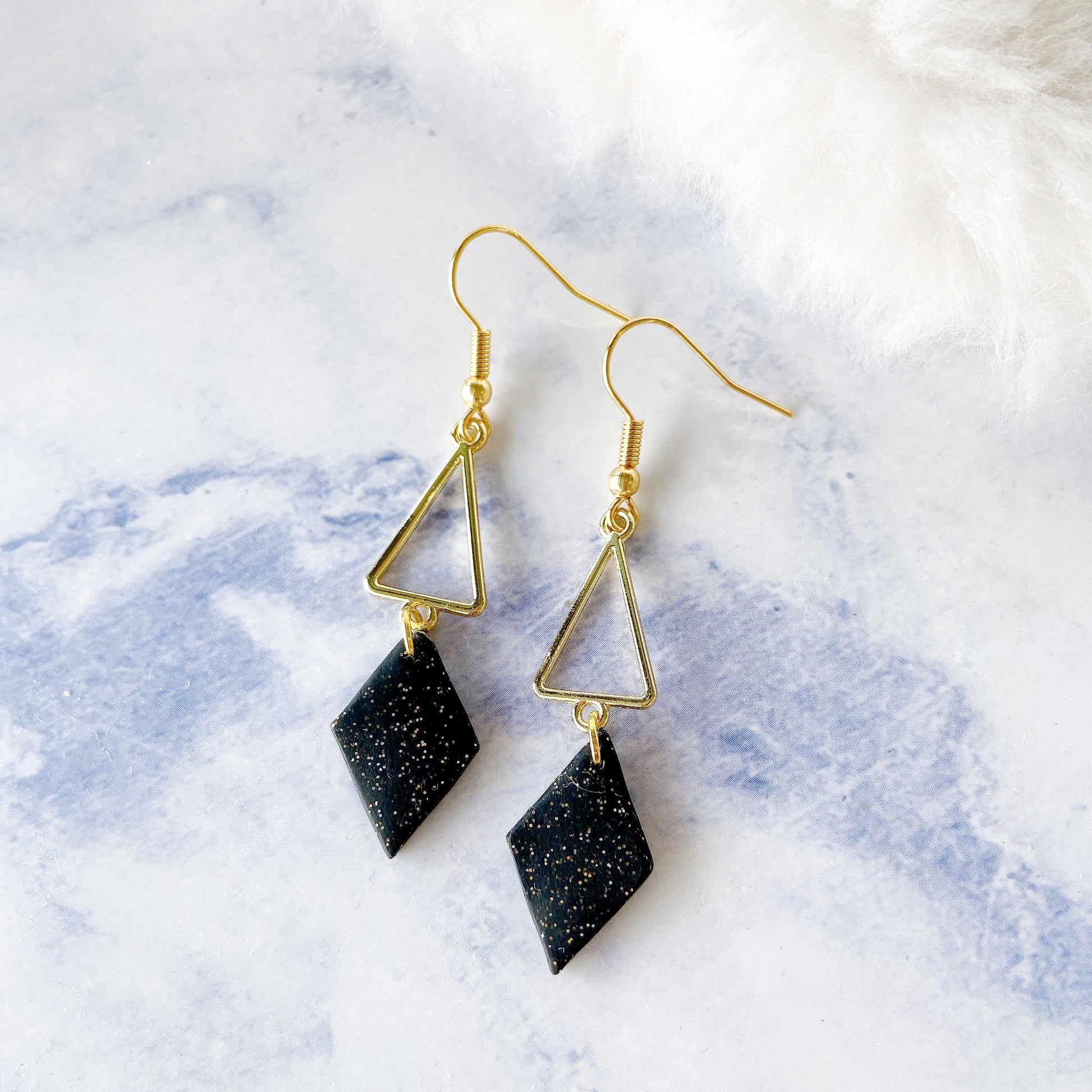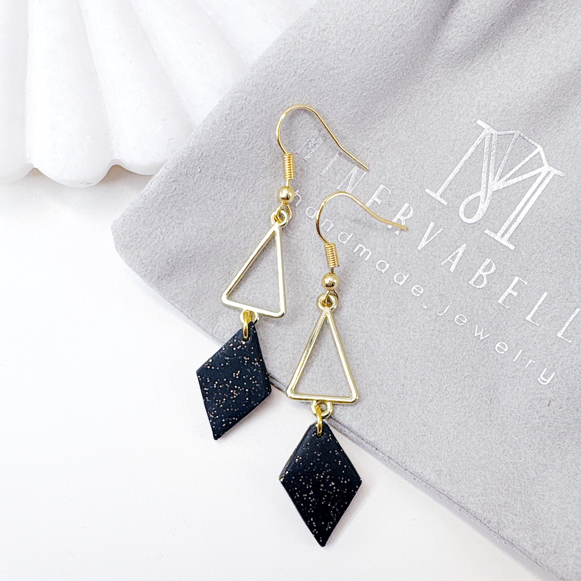 These elegant geometric earrings feature a modern mix of shapes and textures — a gold triangle frame paired with a handcrafted polymer clay diamond charm infused with subtle glitter for a starry sparkle effect.