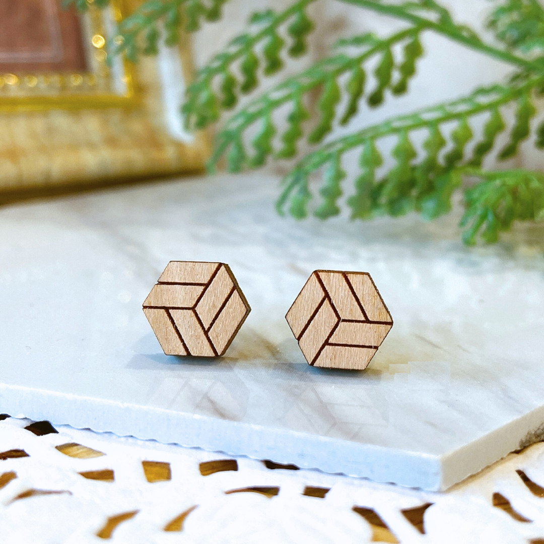 Wooden 3D Pattern Hexagon Hypoallergenic Earring Studs