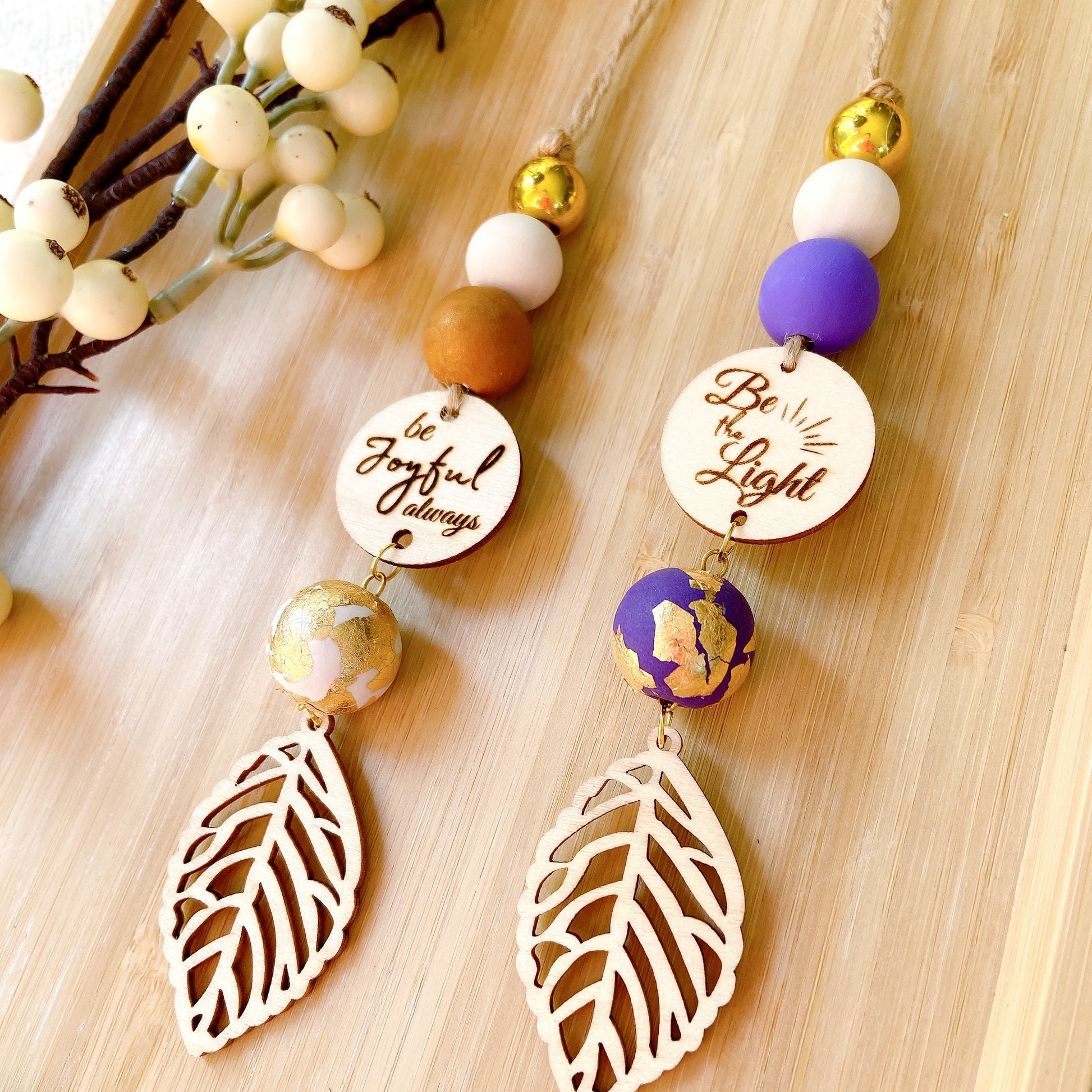 Wooden Leaf with Goldfoil Polymer Clay Beaded Essential Oil Car Hanging Charm